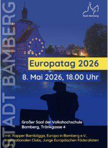 Der 8. Mai markiert als Tag der Befreiung das Ende der Naziherrschaft in Deutschland und akzentuiert am Vorabend zum Europatag unsere tiefe Verbundenheit mit allen europäischen Nachbarn. Aus diesem Anlass findet in diesem Jahr ein EUROPA RAP mit dem Künstler BAMBÄGGA statt, der durch die Internationalen Clubs der Stadt begleitet wird. Seid gespannt, was euch erwartet und kommt vorbei!EINTRITT FREI – UNTERHALTUNG UND ACTION GARANTIERTGib hier deinen Absatz ein